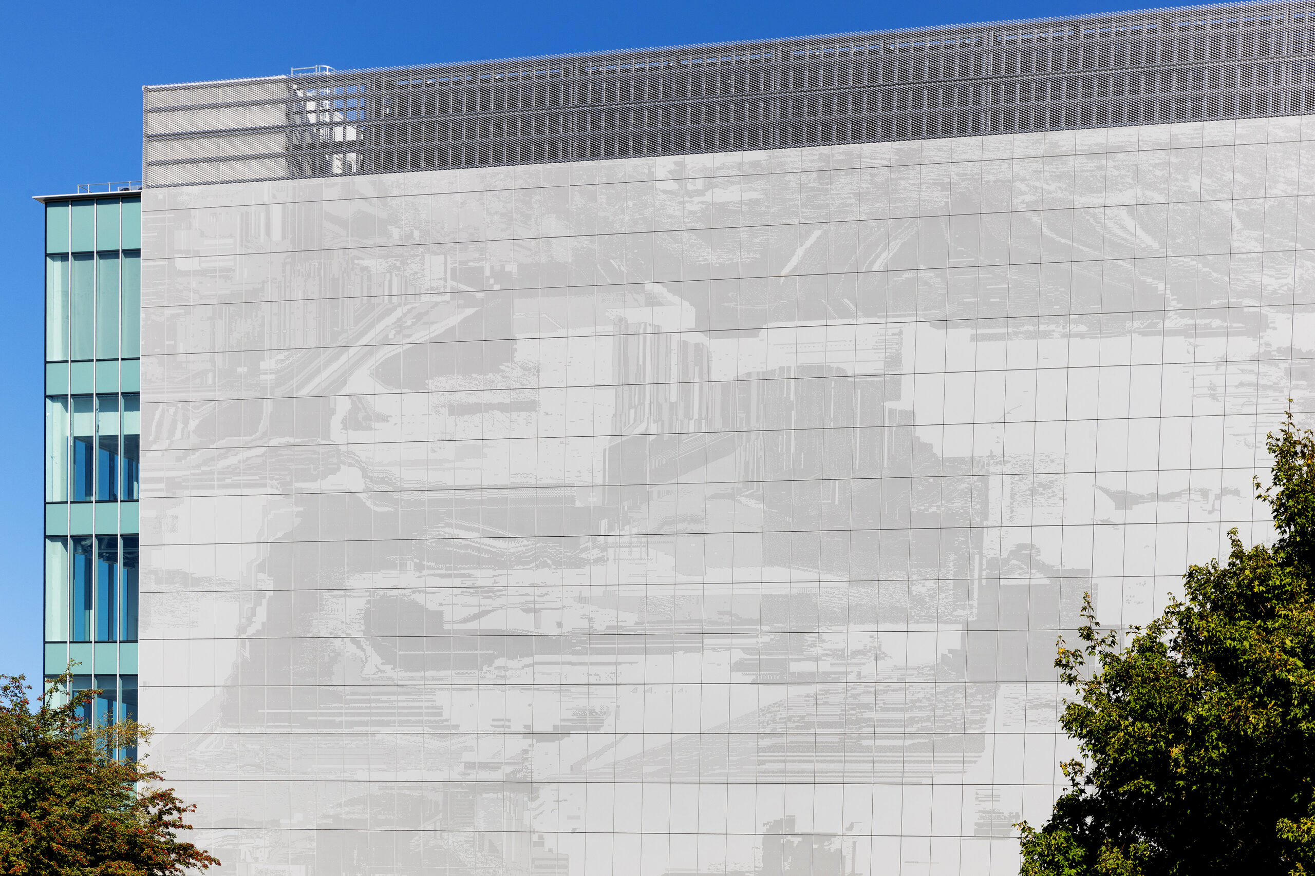 After many iterations and much layering, the finished piece explores what data—something we use daily but rarely visualize—can look like when abstracted in a moment of time. The final artwork consists of perforated aluminium panels which cover the facade facing the adjoining park.